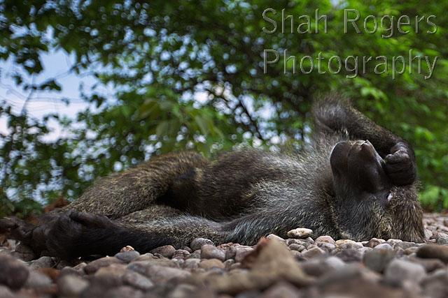 Olive baboon male resting on the ground (Papio anubis). Gombe National Park, Tanzania. September 2014.