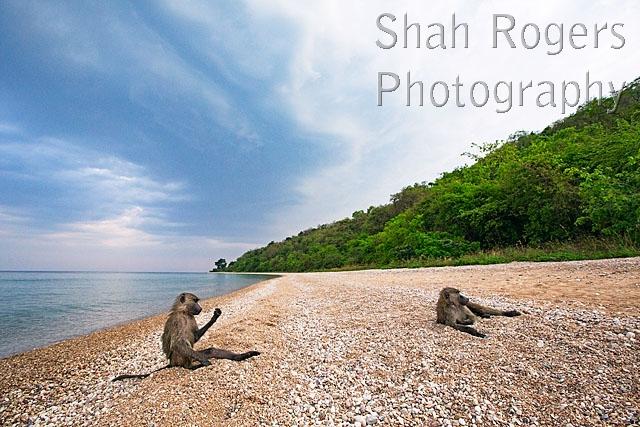 Olive baboons resting on the shores of Lake Tanganyika (Papio anubis). Gombe National Park, Tanzania. September 2014.