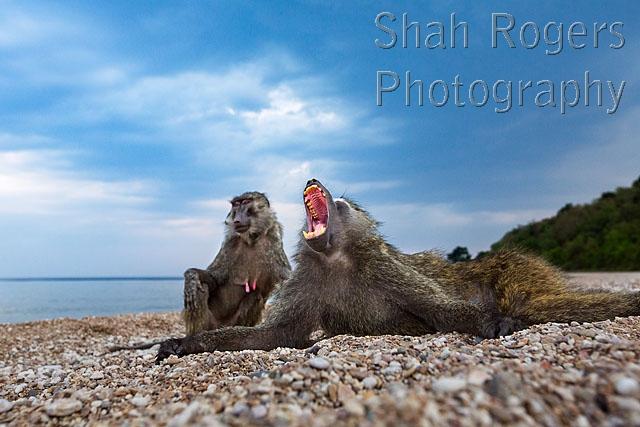 Olive baboon young male and female resting on the shores of Lake Tanganyika (Papio anubis). Gombe National Park, Tanzania. September 2014.