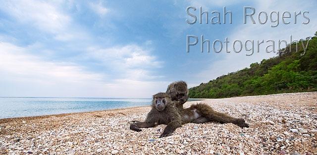 Olive baboon young male being groomed on the shores of Lake Tanganyika (Papio anubis). Gombe National Park, Tanzania. September 2014.