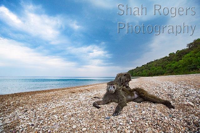 Olive baboon young male being groomed on the shores of Lake Tanganyika (Papio anubis). Gombe National Park, Tanzania. September 2014.