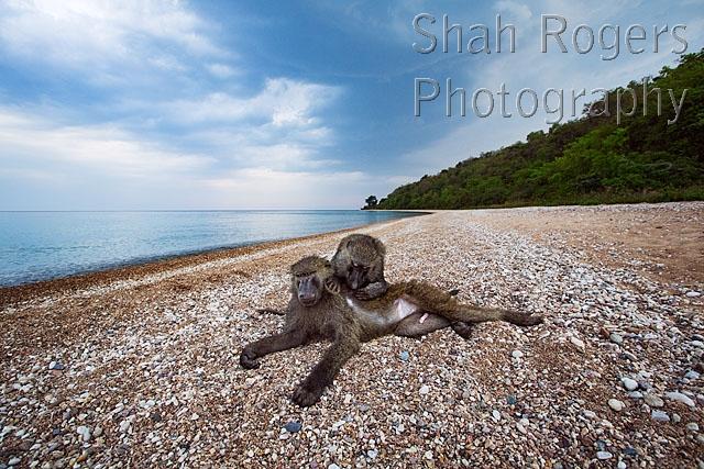 Olive baboon young male being groomed on the shores of Lake Tanganyika (Papio anubis). Gombe National Park, Tanzania. September 2014.