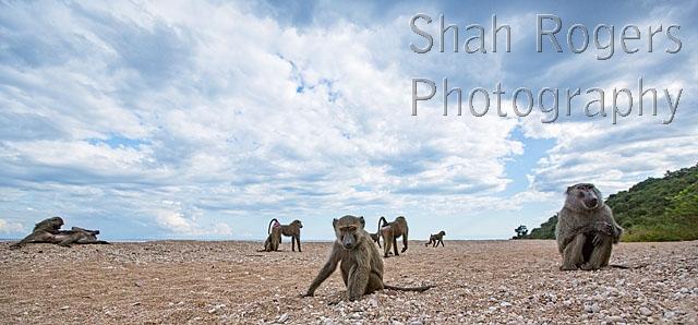 Olive baboons playing on the lake shore (Papio anubis). Gombe National Park, Tanzania. May 2014.